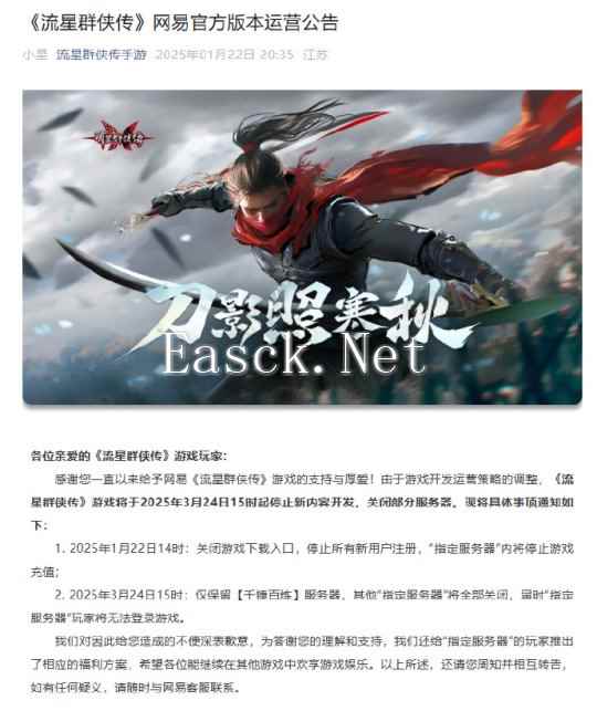 网易宣布,《流星群侠传》游戏将于2025年3月24日15时起停止新内容开发,关闭部分服务器。 1. 2025年1月22日14时:关闭游戏下载入口,停止所有新用户注册,“指定服务器”内将停止游戏充值; 2. 2025年3月24日15时:仅保留【千锤百炼】服务器,其他“指定服务器”将全部关闭,届时“指定服务器”玩家将无法登录游戏。 “指定服务器”列表: 一叶扁舟、一箭双雕、一蓑烟雨、三山五岳、九天鸣凤、九转流锋、乱舞霜华、云中花鸟、 云淡风清、云游四海、亢龙有悔、佳期如梦、侠肝义胆、光风霁月、八方流影、冰魄十剑、 冷月秋岚、凌云健笔、刀剑如梦、剑风纵横、北塞西风、十面埋伏、千山暮雪、千里独行、 卧虎藏龙、含华隐曜、吸星纳云、夕暮尘烟、夜雨春风、大漠孤烟、天下唯尊、天之骄子、 天地无极、天外飞仙、孤岛渔人、寒山石径、寒梅傲雪、寒江孤客、对酒当歌、山外风雨、 山高崖远、平沙落雁、归兴千里、往事如烟、心游万仞、志华日月、惊世骇俗、拔剑四顾、 拨云见日、挑灯看剑、排山倒海、春江花月、暗香疏影、曲径通幽、曼语轻歌、月照九州、 月落乌啼、权倾四海、杨柳依依、枫林暮秋、此身何惧、步月回风、江湖夜雨、浩气乾坤、 浮光掠影、浮生未歇、海上明月、海角天涯、湖光山色、湖心天悬、灯火阑珊、灵犀一点、 灵蛇狂舞、烽烟万里、独上兰舟、狼顾虎视、白虹贯日、百宝锦盒、百舸争流、百鸟朝凤、 盖世英雄、直挂云帆、相忘江湖、碧海潮生、秋风走马、空山夜语、空谷霓虹、精鹜八极、 繁净半盏、绣春映月、羌笛飞雪、羽扇纶巾、芳草流莺、萍踪侠影、落花有意、裘马清狂、 西山明月、观音伏虎、谁与争锋、踏雪寻梅、轻羽碧空、近水楼台、追云逐电、追魂夺魄、 逐鹿中原、铁血丹心、锦绣山河、锦衣夜行、镜花水月、长夜不休、长河落日、问鼎九州、 阳春白雪、雄霸天下、雪明映月、青霜傲雪、静影沉璧、韶华易逝、风华正茂、风清月白、 飞云惊鸟、飞花逐月、高山流水、魁星点斗、鸿飞冥冥、鹏飞长空、黯然销魂、龙飞破煌。 此外,官方还给“指定服务器”的玩家推出了相应的福利方案,共有两项福利。首先,自公告发布之日起至2025年3月24日15时止,《流星群侠传》现有玩家游戏账号中尚未使用的元宝可继续使用。截止至2025年1月22日14时,《流星群侠传》玩家的网易邮箱/手机账号中尚未使用的收费元宝(特指玩家通过法定货币充值获得的元宝),网易将以等额点数的方式存储于玩家网易邮箱/手机账号里以作为补偿,玩家可继续在网易公司旗下的其他相关游戏中使用该点数。 其次,网易公司针对《流星群侠传》玩家推出以下福利活动,玩家可在《永劫无间》手游中获得网易游戏成长福利。截止至2025年1月22日14时,所有曾经登录过《流星群侠传》的游戏账号,玩家将可以在2025年3月24日15时前使用该账号登录网易游戏成长福利领取页面,在选定服务器并创建新角色后,将可在网易公司前述游戏中领取福利。 |