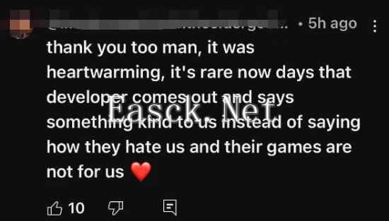 “我们也感谢你,哥们。这太暖心了,开发者对玩家表达善意,而不是说他们多讨厌我们,说他们的游戏不是做给我们的,这太少见了。”