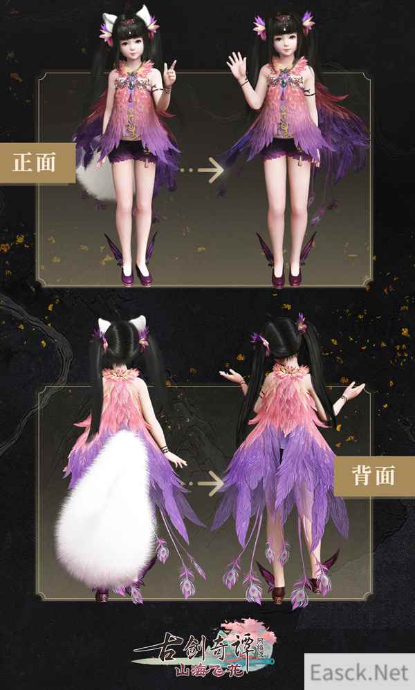 粉发搭配不同外装效果 此外,游戏中提供了摄型裁衣的玩法,通过参与秘境闯关、完成日常活动等多种途径,可获得摄形材料,收集完成后即可获得心仪外装。 异芳的狐耳与狐尾,可自定义显示&隐藏 古剑世界的异芳门派,因是灵狐之后,狐耳和狐尾是她们的标志性特征。近期因一门修炼功法的逐步完善,狐耳、狐尾可自定义隐藏与显示啦!这将大大满足她们的外形穿搭需求,在着装界面根据自己的偏好选择性隐藏,外装搭配从此有了更多样的选择!