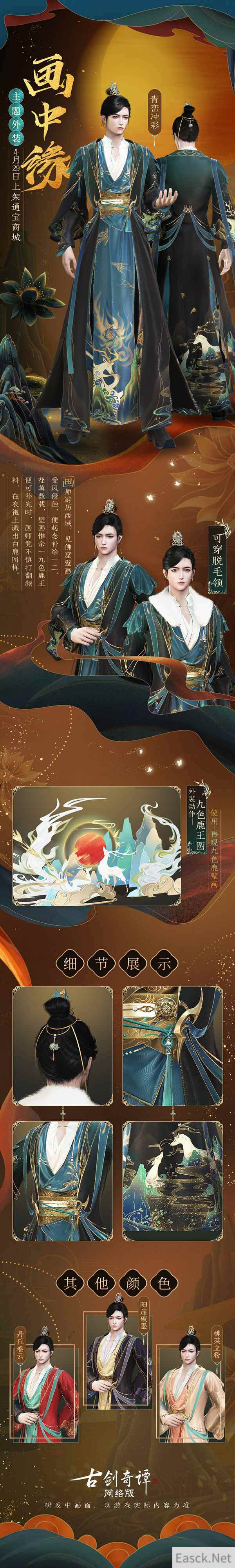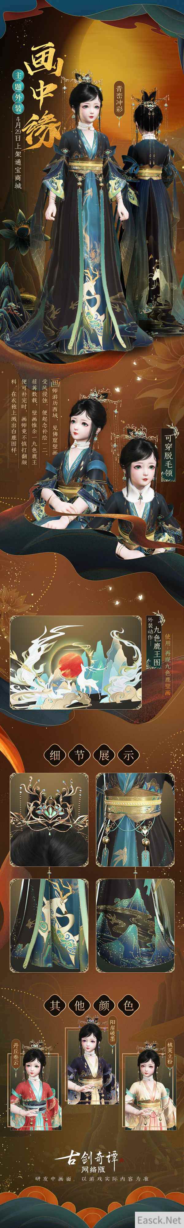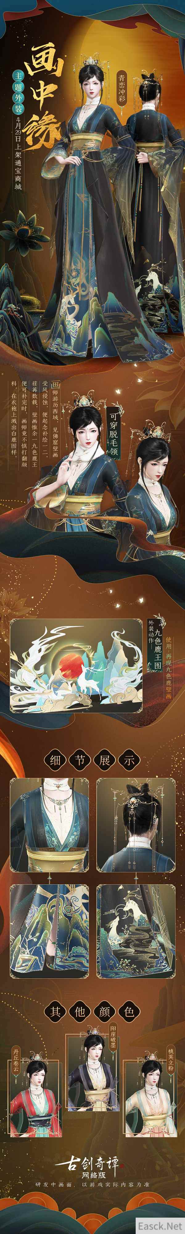 “画中缘”系列新衣共有成男、成女和少女三体型供仙家弟子选择购买,颜色款式有青峦冲彩、桃荚立粉、阳崖破墨和丹丘卷云四款。 “野有鹿王兮,角白如雪,其毛九色,众鹿伏从,数千为群……”只需购买“画中缘”系列新衣,就能激活外装专属特效“九色鹿王图”,使用后可在重现佛窟九色鹿壁画,一览神鹿风采。 鹿踏青野,其声呦呦 与“画中缘”系列新衣同一时间上架通宝商城的,还有两件华丽优雅的披风——青苹赋与白鹿吟。