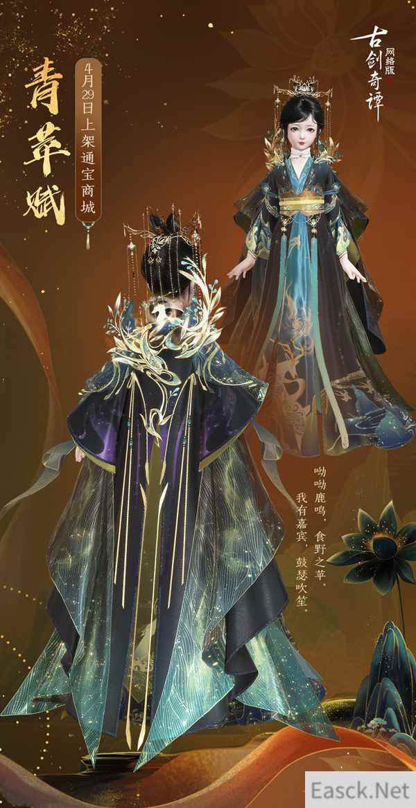 新披风细节欣赏这就来了,快随文章一同看看! 披风“青苹赋”的主体虽深色,深邃而华丽的配色让人想起九色鹿居住的美丽森林。薄纱部分的渐变设计流光溢彩,搭配了珠玉金丝等配饰,更是光华万千。