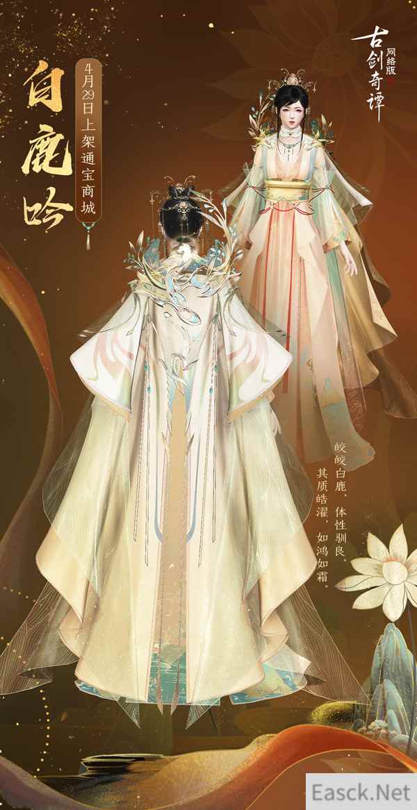 风动心弦,莫负春光!《古剑奇谭OL》春季版本“风动心弦”现已上线!——心弦争歌再临,更有全新列传更新,还有精彩踏青活动等你参与! “梦里入苍山,烟树影斑斑。林深金乌落,溪浅白鹿眠。” 画师修补的佛窟壁画,讲述了九色鹿王的故事。相传,神鹿住在幽深的山林中。 “神光九色灿,新角若雪研。蕉下何处寻,黄梁怎回堪?” 美丽的鹿王周身散发着耀眼的九色光华,想要继续上前追寻鹿王的踪迹,却发现眼前绮丽不过一场黄梁。传说中的九色鹿难以寻觅,但画师的一段仙缘奇遇,让鹿王的身姿留于华服之上。快随文章一同欣赏新衣细节,来体会这份奇妙的画中仙缘! 画中缘·成女款细节展示 成女款衣裙可谓是华贵而优雅:珠玉环翠缠作步摇,霞色金光染上广袖。裙摆处的图案再现了神话中所记深山白鹿的景象,点点星色闪耀,更添梦幻。