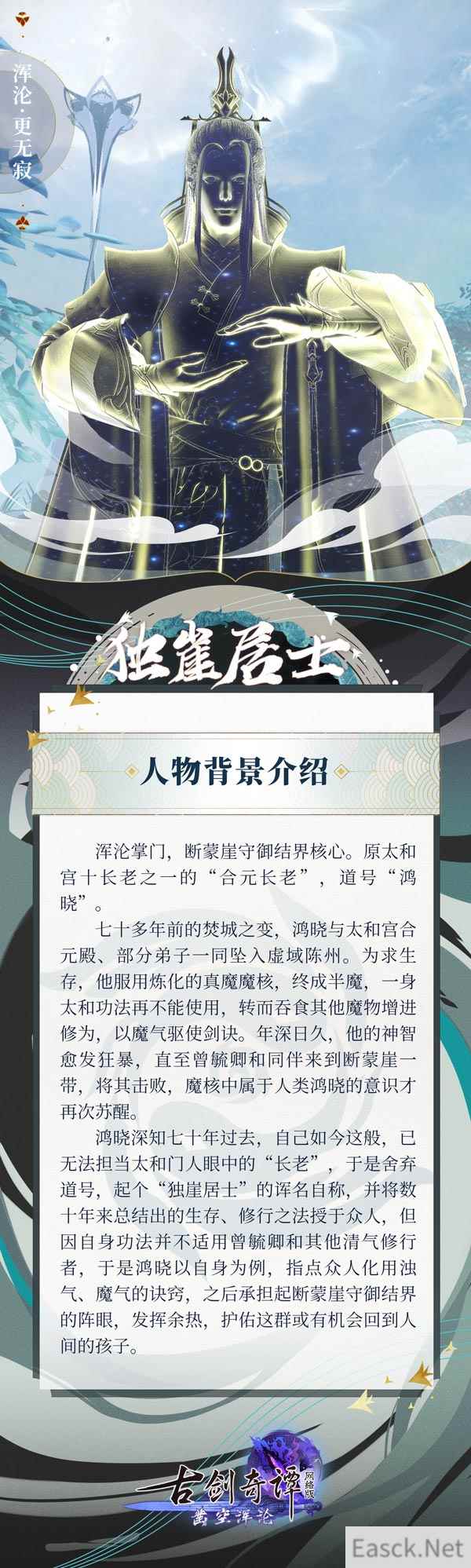 2022年度版本预约活动现已开启,参与预约就有机会获得诸多好礼!全新精美特效挂饰、实体周边、通宝代金券……更有机会成为天选之子,获得“至尊锦鲤”大奖,商城外装统统带回家! 清浊聚涌浑沦生,炽焰寒云斗孤城。待到龙蛇相逢日,白骨飞来化归蓬。 陈州新城之上,苍骨以无名之剑斩破虚域裂隙,空间震荡,虚域·陈州自此与外界连通,居于此间的浑沦门人也终于出现在世人眼前。他们是为何聚集在此,又是如何在浊气与魔气如此浓郁的虚域之中生存下来的? 今日就让我们一起走近全新门派“浑沦”背后的故事吧! 【绝境求生,浑沦现世】 天、人、地三界之外,有位于所有空间反向的魔域,各空间区域之间,又有名为“虚域”的连接通道。 约七十年前,瘟神座下的蜚兽祸乱人间,占据陈州,最终帝首剑主李重秀凭借神剑之威,将蜚兽诛灭。这一剑甚至劈裂空间,陈州城与城内的百姓、蜚兽,连带陈州周围的修仙名门一同坠入了裂隙内的虚域,这其中就包括太和宫的合元长老鸿晓。 因蜚兽遗毒弥漫,又恰好有通往魔域的空间裂隙,虚域·陈州之中不仅有诸多妖魔盘踞,浊气、魔气也十分浓郁。坠落此间的太和宫殿,本是合元一系凝练五行之力的地方,鸿晓意外发现这些旺盛的五行之力与帝首剑劈下时的灵威相激,竟然在断蒙崖一带形成了一个特殊的灵力结界,产生了类似净化的效果。在此绝境之中,鸿晓便借助这几分珍惜清气苦苦支撑。