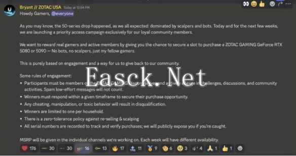美国的 ZOTAC Discord 频道管理者发出公告:「了解市场上充斥黄牛搜刮 RTX 50 系列显卡,从今日与接下来数週,我们将为忠实的社群用户发起优先购买活动!我们希望让真正的玩家可以买到显卡,杜绝机器人、杜绝黄牛,只卖给玩家们。」 ZOTAC 为了尽可能确保能在活动中抢到卡片的人都是真人玩家,规定下面数条规则: