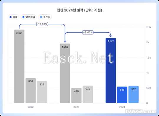 日前,《奇迹》(MU)开发商网禅公布了2024年财报。 1、2024年财报 网禅 2024年的营业收入和营业利润分别为2147亿韩元和545亿韩元,较2023年分别增长了9.4%和9.3%。然而,当期净利润为567亿韩元,同比下降了1.4%。
