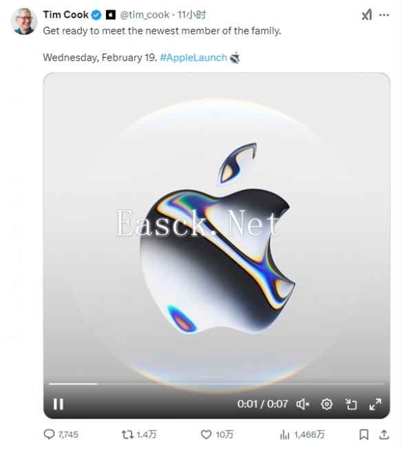 苹果官方计划在2月19日推出一款被公司首席执行官蒂姆·库克称之为“家庭最新成员”的产品。库克在X上还发布了预告,但并未公开更多的细节。库克的发帖推动苹果股价周四一度上涨2%。