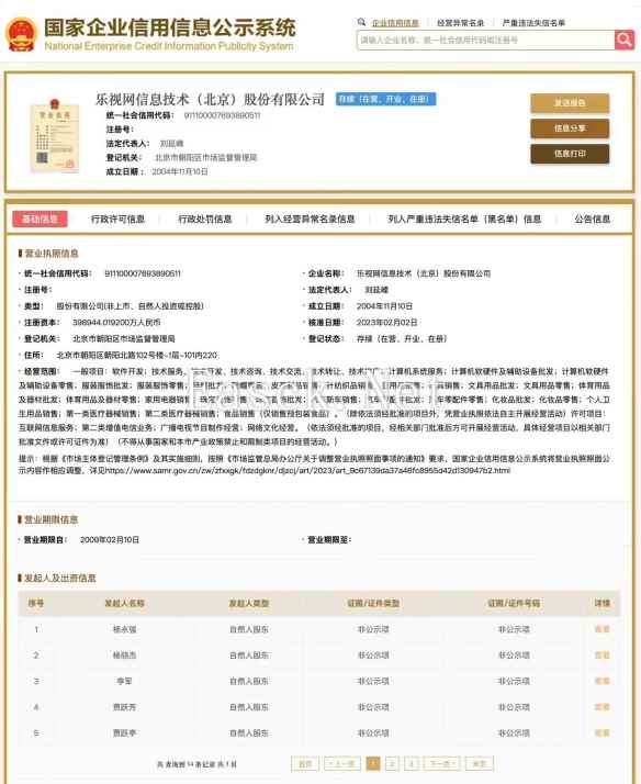 据国家企业信用信息公示系统显示,乐视网信息技术(北京)股份有限公司2025年2月14日新增一条被执行人信息,执行标的1.1亿余元(111,666,736.00元),执行法院为北京市朝阳区人民法院,案号为(2025)京0105执6968号。 乐视网信息技术(北京)股份有限公司成立于2004年11月,法定代表人为刘延峰,注册资本约39.9亿人民币,经营范围包括汽车新车销售、互联网信息服务、第二类增值电信业务、广播电视节目制作经营、网络文化经营等。 股东信息显示,该公司由贾跃亭、刘弘、毕绍波等共同持股。 |