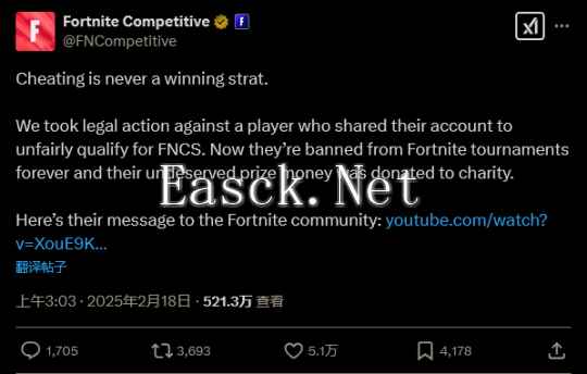 Epic终身封禁作弊《堡垒之夜》选手 奖金全额捐给慈善