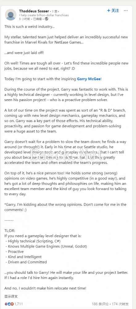 但《漫威争锋》游戏总监Thaddeus Sasser,近期却在领英上发布动态,称自己所在的整个团队被网易突然裁掉。而这则消息,也得到了西雅图团队的开发人员证实。