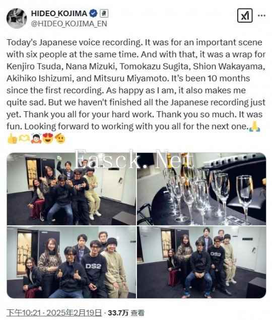近日,小岛秀夫在X上发文更新了《死亡搁浅2:冥滩之上》的开发进度,游戏针对一个重要场景进行了日语配音的录制,共有六人参与了配音,分别是津田健二郎(山姆)、水树奈奈(芙拉吉尔)、杉田智和(Dollman?)、若山诗音(明日)、石住晶彦(亡人)、宫本充(Tarman),小岛秀夫还晒出了与各位配音演员的合照。
