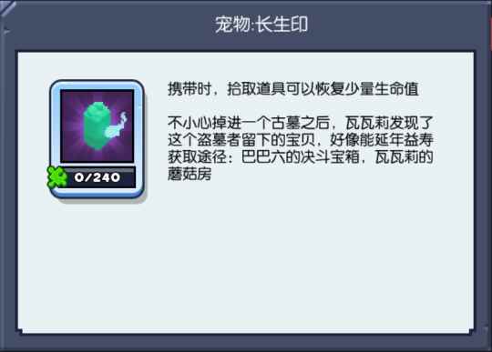 恢复系:长生印 这是瓦瓦莉在不小心掉进一个古墓之中后,无意中发现的,是一个盗墓者留下的宝贝,从其散发的看,好像具有延年益寿的效果,虽然不知真假,但是携带后,的确能在拾取道具的同时恢复少量生命值,这无疑大大加强了在蘑菇岛中生存的几率!