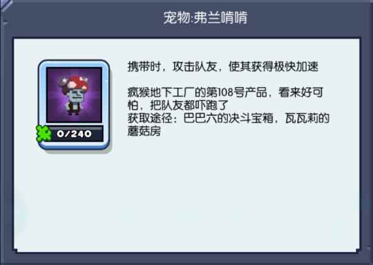 辅助型:弗兰啃啃 听说有队友坑你?那么当你看到这只弗兰啃啃的时候,你一定会大呼,坑队友的新时代要来临了!这是疯猴地下工厂的第108号产品,看起来十分可怕,总是会将队友全都吓跑。携带者能够通过攻击队友,使队友获得极快的移动速度加成!这意味着,当你被队友推向敌人斧下时,你很难通过操作跑掉了!