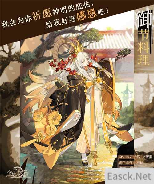 美味的御节料理相当于是日本人的年夜饭,它会用多层的盒子装置,每一层装置的不同的食物拥有着不同的寓意。第一层主要会有一些象征喜庆的小菜,伊达卷、海带卷、糖煮黑豆等等。第二层会有烤鱼虾等等。第三层会有一些煮菜:莲藕、芋头、竹笋等。有的也会有四层或者五层,四层会有萝卜丝,五层的话一般不会装置食物。 据透露,御节料理是本次上线的全新UR辅助系飨灵。在设定上,她是一位巫女,她代替了她的御侍成为了巫女,并为皇室祈福。虽然她身份高贵也总是摆出骄傲的姿态,但其实内心就是个普通的女孩子。 御节料理的原画是由知名画师@STAR影法師 担当,并由新生代声优偶像组合V17声优少女中的十四来担任中文配音,她不仅擅长诠释活泼开朗的外向型角色,又对塑造情感丰富细腻的内秀型角色得心应手。相信她一定能为各位玩家们展现出御节料理的人物感情设定。