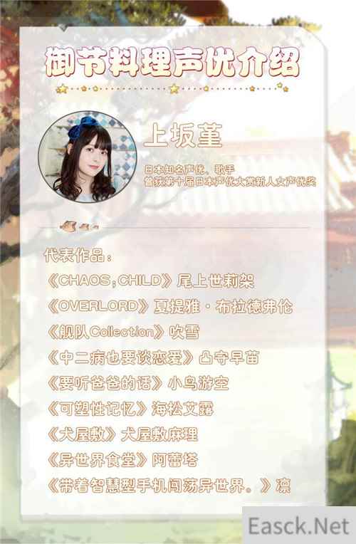 御节料理的日文声优是上坂堇所配,上坂堇是日本的知名声优。在2012年担任TV动画《要听爸爸的话!》担任主要角色小鸟游空并收到了广泛的关注。在2016年,她获得了第10回声优奖中获得新人女声优奖。因为喜欢俄文以及文化,所以,在大学时期选择攻读俄文。同时也是一位军武宅,所以也有着“政委”的称号。