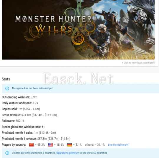 现在据Gamalytic网站数据显示,目前《怪物猎人:荒野》在Steam上的预估预售量已达到100万份,总收入为7480万美元(约合人民币5.42亿元)。国区占比达到45.2%,美国地区占比18.6%。