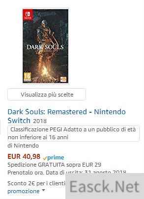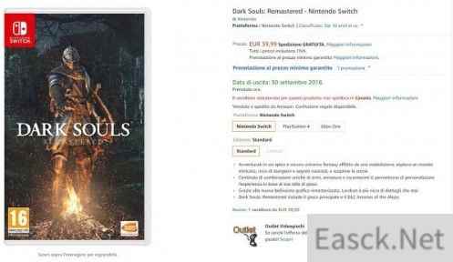 《黑暗之魂:重制版》这款一直备受期待的游戏,终于爆出发售的时间了,就在今年的9月底,虽说不是官方爆料的发售时间,但是可靠性还是有的,本次爆料是意大利亚马逊,之前就已经有人说《黑暗之魂:重制版》力压众多游戏,相信等正式发售的时候,会给大家带来更多的惊喜。 《黑暗之魂:重制版》已在5月24日登陆PS4/XB1/PC平台,然而Switch版《黑暗之魂:重制版》却跳票延期至今年夏季发售,近日意大利亚马逊泄露了任天堂Switch版《黑暗之魂:重制版》将于2018年9月30日发售。 很多玩家都认为这个发售日期不准,疑似意大利亚马逊的占位符,不过在此前Switch版《黑暗之魂:重制版》在亚马逊意大利商店页面显示的一个占位符日期:8月31号,而这次修改成9月30日,应该不仅仅是为了站位了 另外,根据网友爆料的亚马逊意大利发出的邮件显示,游戏会在10月1日发售,所以《黑暗之魂:重制版》在9月30日或10月1日登陆NS平台还是非常有可能的。