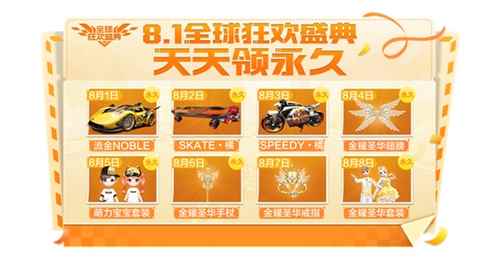 8月1日至3日,玩家们登录游戏即可领取全球狂欢盛典限定永久载具。8月4日,永久金耀圣华羽翼等待车手们领取。萌力宝宝套装将于8月5日以礼盒形式派送,套装以宝宝性别为准。8月6日至8日,金耀圣华手持、金耀圣华戒指和金耀圣华套装登录即领,车手们千万不要错过啦!