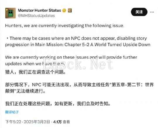 卡普空在公告中表示:“猎人们,我们正在调查以下问题。部分情况下,NPC 未出现,导致主线任务第五章第二节的剧情无法推进。我们正在解决这一问题,并会在有新进展时向大家更新。”