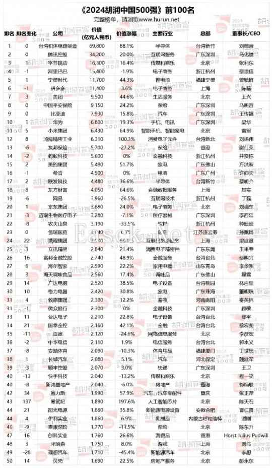 而在上榜企业中,涉及游戏业务的企业共有14家。包括腾讯、字节跳动、阿里巴巴、网易集团以及新上榜的台湾游戏公司鈊象电子。其中,腾讯控股保持第2位,价值达到34200亿元,涨幅达20%。网易排名下降6位,以3960亿元位列第19,价值下降26.5%。 ??