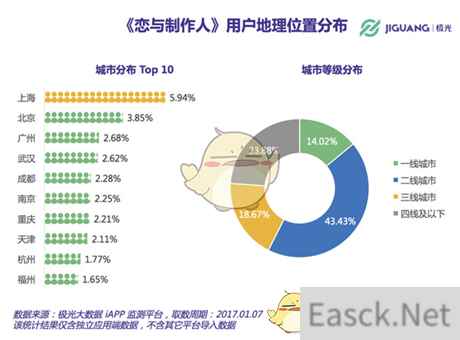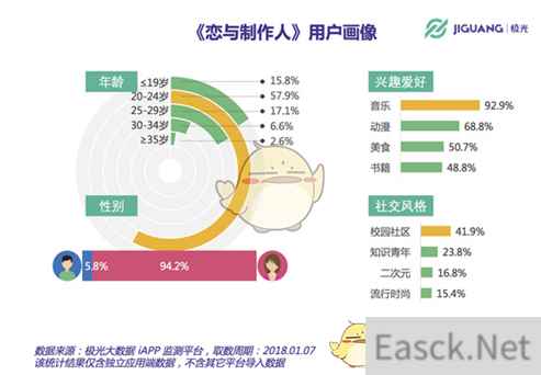 其次,从用户自画像上来看,《恋与制作人》的一二线城市用户占比接近60%。此外,女性用户占比达94.2%,24岁以下用户超过70%
