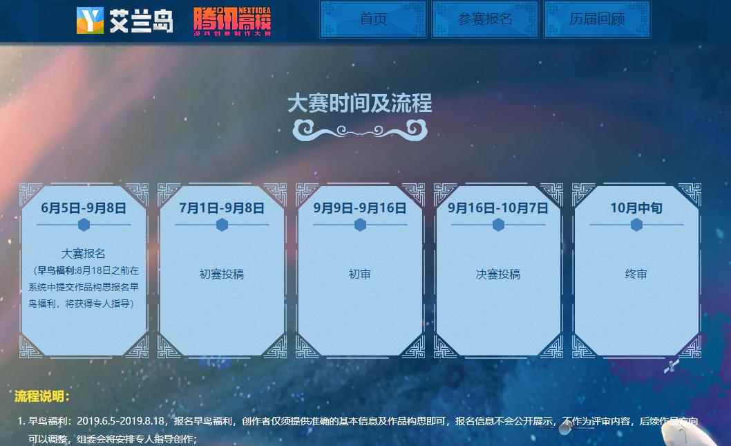 赛事流程 本次大赛首次启动了“早鸟报名”机制,参赛团队在8月18日前报名,就能在作品研发的早期就获得独有服务。专家团队将在包括策划、美术、程序、项目管理等各个领域,为作品提供一站式优质建议和助力。本届赛事还将会为优秀参赛作品提供各类稀缺的扶持资源。优秀参赛者还有机会获得腾讯公司实习机会,对在校学生而言,本次大赛是不可错过的绝佳机会!这一次,忘记所有的条条框框,大赛不限主题,让你的脑洞带领你创作出前所未有的创意作品,勇往直前探索沙盒的界限!