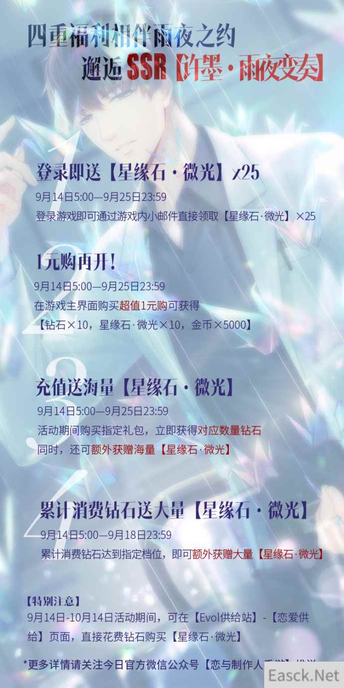 9月14日5:00~10月14日23:59(共31天),唤醒【星缘石·微光】,获得【星辰碎片】,随机附赠包含限定SSR羁绊碎片在内的多种珍贵道具。 【星辰碎片】可在【星夜商店】兑换体力、金币、告白心愿、三星课程卡、星河许愿券等多种道具。 9月14日起,游戏内将同步开启【登录送、超值1元购、充值送、消费送】四大福利活动,助你邂逅心动羁绊!