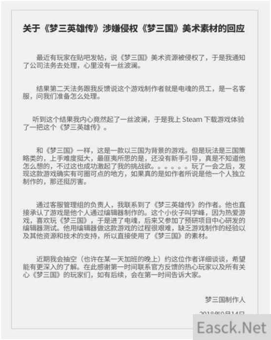 在公告中,《梦三国》制作人知晓事情后第一时间联系公司法务进行处理,随后却又被告知《梦三英雄传》的游戏作者是电魂的员工,并且是客服部的一位小伙。 带着复杂的心情,这位制作人一边上steam体验了一把这个“盗版游戏”,另一边着手约谈作者。 从这份官方声明中不难看出,《梦三国》制作人对这个游戏还是持肯定态度的,指出该游戏确实有可圈可点的地方;但作为“新手上路”,游戏还有很多不合理的设计,比如缺乏新手教程,前期难度过大等。 在了解到他的经历和难处后,《梦三国》的制作人决定帮他一把,希望有机会深入了解一下。 ■故事结尾 不久后,《梦三国》官方再次发声。
