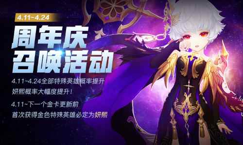 三、召唤概率提升活动 周年活动期间,妍熙的召唤概率也获得了大幅度提升,首次召唤的金卡特殊英雄必定为妍熙!