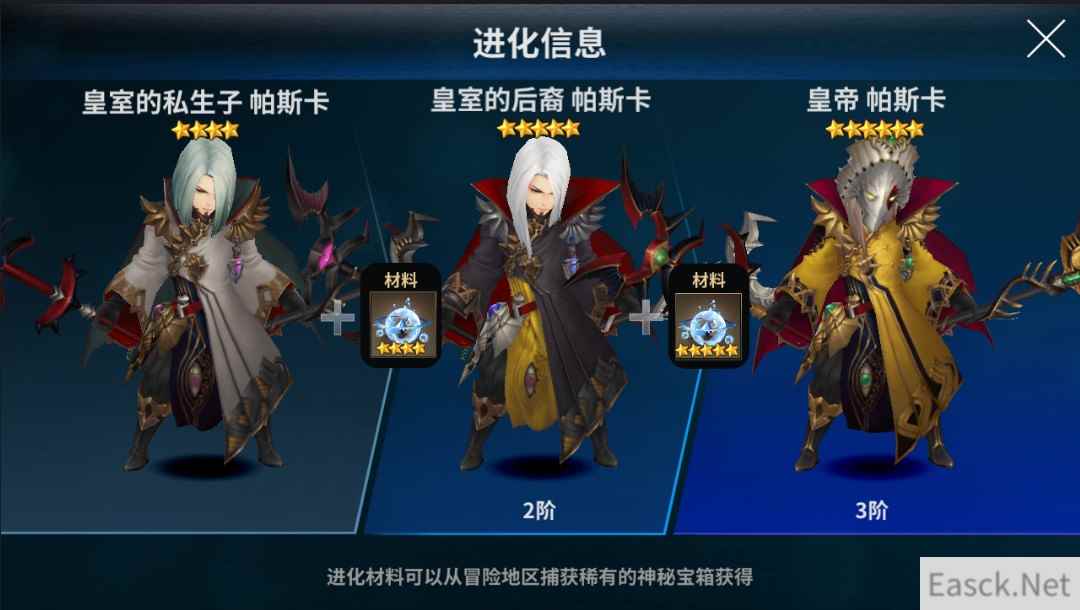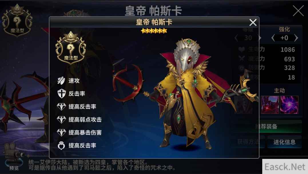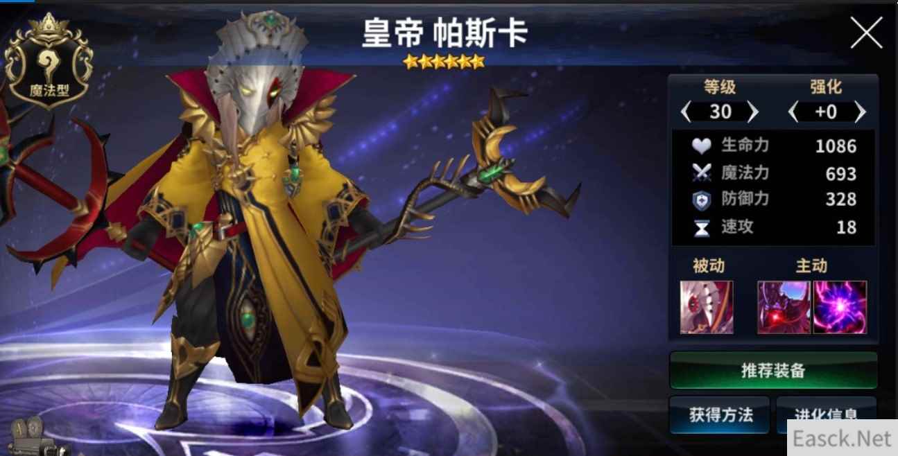 【皇帝帕斯卡 技能详解】 被动技能:天子权威 提升自身60%的魔法力、暴击和弱点攻击率,且附带1次所有伤害免疫效果 技能详解:提升魔法力、暴击和弱点攻击率,配合一技能,单体输出的伤害会很可观。 技能一:破坏巨人 对1名敌方单位造成600%魔法力的魔法伤害,附带无视防御效果。 技能详解:该技能会使单体伤害很高,另外,帕斯卡作为特殊英雄,在成长和后期潜力方面,都比普通英雄要更好。相信在各个战场,会有他的一席之地。