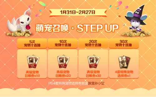 三、萌宠召唤STEP UP 随着全新宠物孙小空的降临,想必各位骑士们也都眼馋不已,相信这次上线的宠物十连召唤奖励活动一定可以满足大家的新年愿望。在活动期间只要进行宠物十连召唤达到一定次数,即可领取丰厚好礼。当十连召唤次数达到30次时,还可额外领取4星特殊宠物选择券一张。友情提示一下,选择券就包含最新宠物孙小空哦~