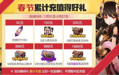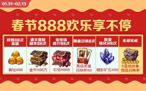 二、春节888,新年发发发 春节这个如此隆重的节日里,一发签到奖励当然是难以填满各位骑士的胃口哒,所以这次的新春嘉年华活动自然要将福利给进行到底。春节888活动的到来就是在为所有的玩家们添了个最传统的彩头,活动期间只要挑战所有与8相关的任务,都可以领取各种好礼。挑战奖励逢8必得,奖励数量自然也是一路8到头,预祝骑士们在新的一年一起发发发!