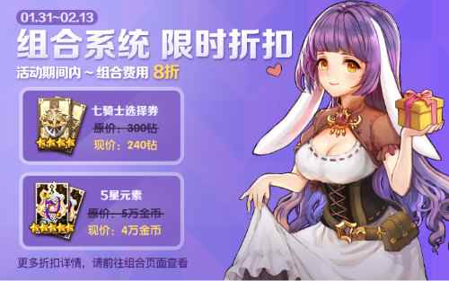 五、组合系统,统统8折 既然是新版本上线,一向擅长为玩家谋福利的《十二战纪》自然又双叒叕将开展新一轮的花式打折活动。此次活动期间的打折项目终于来到了骑士们期盼已久的组合系统的物品组合费用,七骑士选择券只需240钻、5星元素直接便宜一个万!统统八折,一律八折,说是《十二战纪》的双十一也绝不为过了。