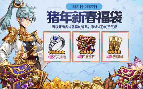四、猪年新禧,福气“袋”回家 新年将至,相信大家也已经开始了年味满满的假期生活,接下来可就是检验各位新春福运的时候咯。2019新春活动福气“袋”回家活动正式开启,玩家们可以每次使用300红钻来开启一个新年福袋,不同福袋内可是分别包含了5星不灭戒指、4星四皇宝石、四星特殊英雄等各种道具,还不赶紧来试试手气!