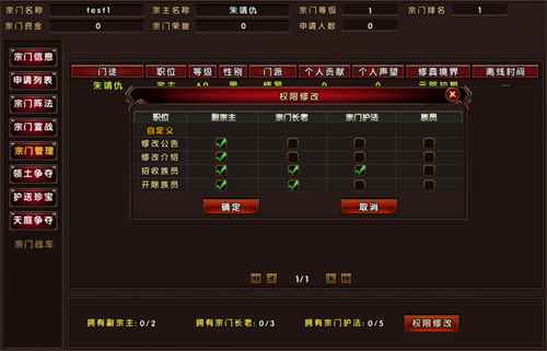 【尽忠职守 广招纳贤】 想让一个宗门走向强盛,首先需要广收成员。身为宗主必须尽一切可能邀请广大仙友加入自己的宗门。扩大宗门规模期间,也一定要管理好宗门各项事务呀。为了让宗主有忙里偷闲多打两只BOSS的时间。在宗门系统中,设立了副宗主、长老与护法的职位,宗主可以根据宗门实际情况安排职务。本着能者多劳、权限可控的目的,宗主可以设定不同职务的职能权限。但是为了宗门更好的发展,切勿做甩手掌柜哦!