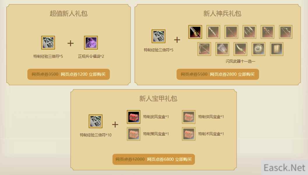 网页超值礼包 玩家可以在限定时间内,前往活动网页购买新人礼包,共有三款礼包可供选择(仅可通过网页商城券购买),还可享受专属礼包折扣!购买礼包可获得正规兵令福袋、自选闪凤武器、特制防具宝盒等道具,士兵、武器、防具一应俱全,全力助阵新人玩家玩转三国战场!