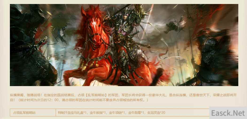 专属占城奖励 在指定时间的国战结算后,占领【乱军前哨站】的军团,军团长将会获得一份豪华大礼(在国战结算后拥有城池才视为占领),是合纵连横,还是傲世天下,荣耀之战即将开启,快来赢取特制汗血宝马、金牛扳指、朱冠灵血等珍稀道具!
