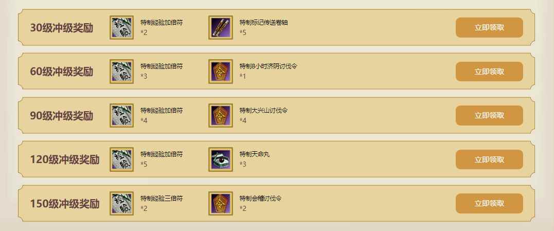 成长礼包奖励 玩家在活动时间内,每提升一定等级就可以在活动页面领取丰厚的经验礼包奖励,获取大量特制经验符、特制讨伐令等道具。新服开启,在经验礼包的加持下,快速地提升角色等级吧!