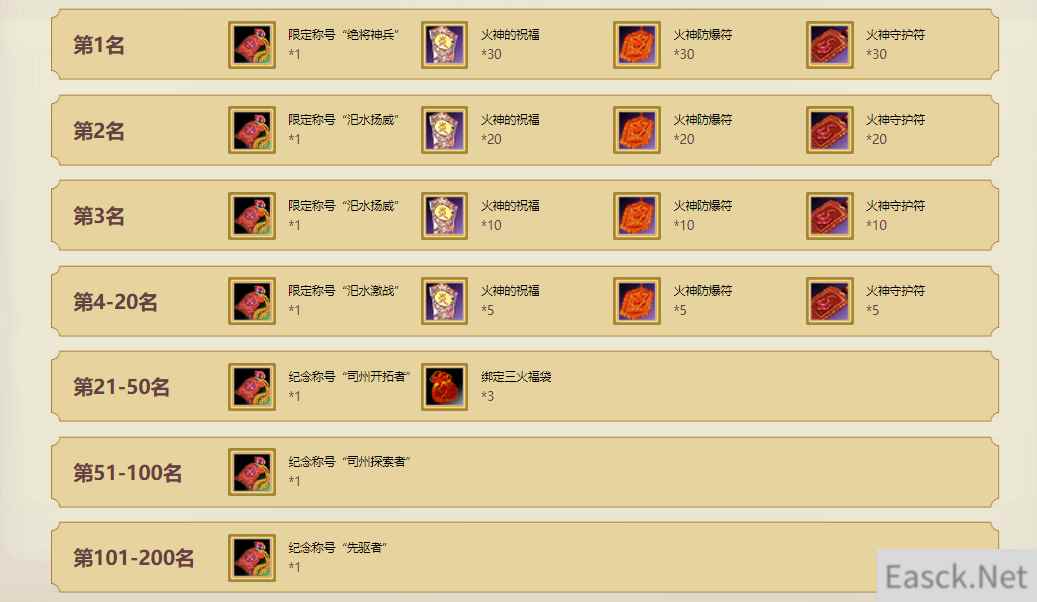 冲级排名奖励 双服开启后,活动页面将同步上线冲级排名奖励活动,活动时间结束后,所有在冲级排行榜上的玩家们都可以获得特殊称号以及“三火”等道具奖励。排名二、三名的玩家可获得限定称号“汜水扬威”,排名第一的玩家还将获得版本限定称号【绝将神兵】!开服冲刺,名列金榜,成就非凡!