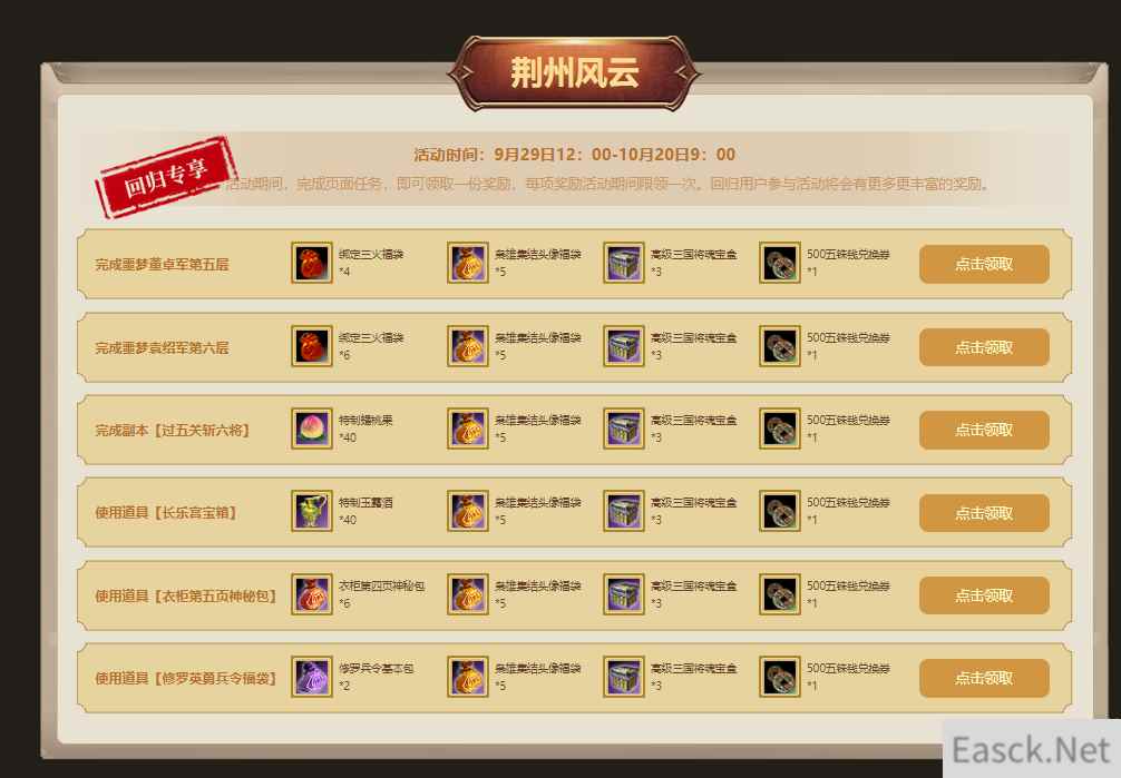 版本活动 新版本上线后,将开放诸多限时版本活动。玩家每日登录,即可免费获取实用道具奖励!与此同时,“赤壁战起”活动也将同步上线,指定时间内占领【襄阳城】的军团即可获得一份豪华大礼! 除此之外,本次活动还将为回归玩家提供回归奖励,达成指定条件即可领取价值288元的专属福利!快叫上同伴重归三国,并肩征服赤壁吧!