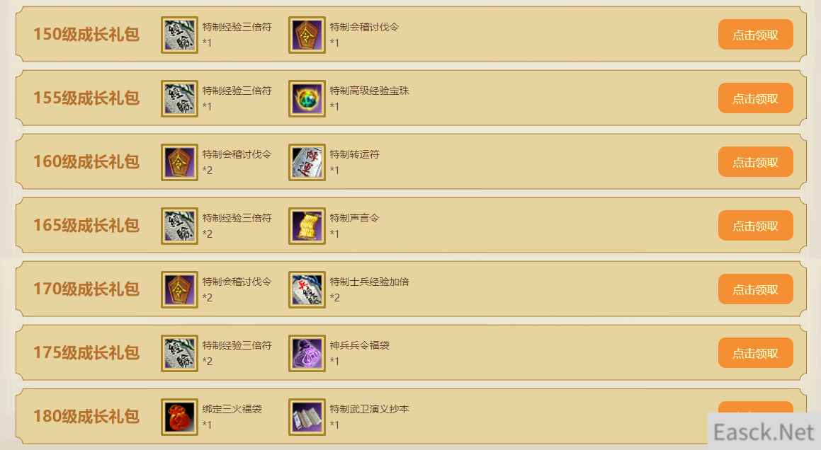 助力冲级 领取升级礼包 玩家在新服创建角色,活动期间内,创建的角色从1-180级,每提升一定等级,就可以在活动页面领取一份豪华冲级大礼包!礼包共分为11档,内含特制讨伐令、特制经验三倍符、正规兵令福袋等稀有道具,经验翻倍加不停,全力助阵玩家升级之旅!