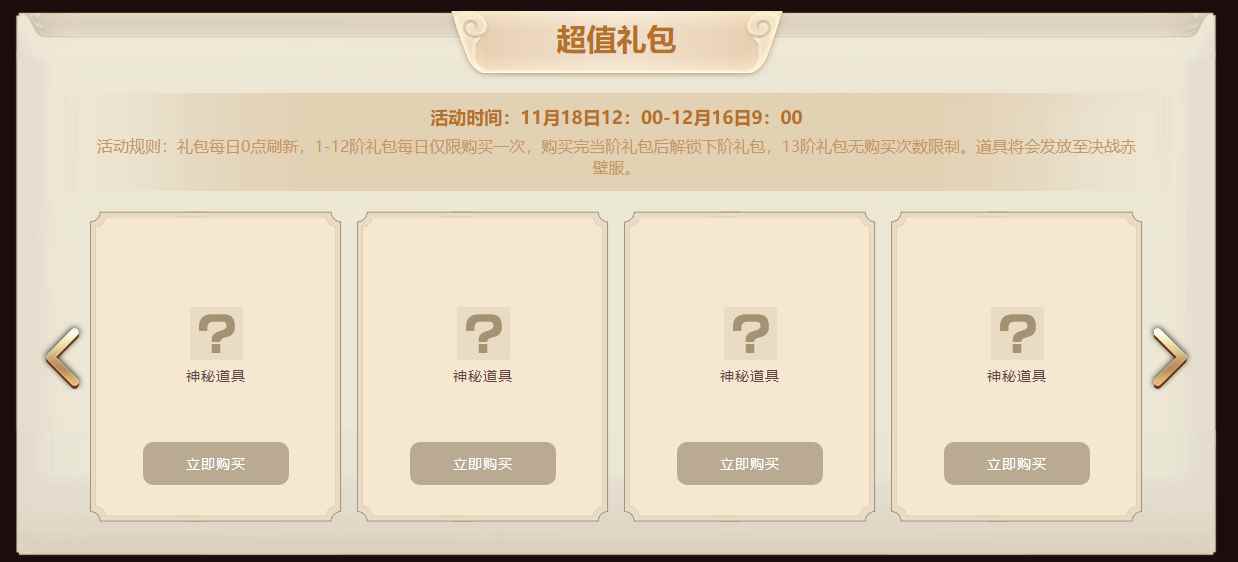 新人豪礼 网页礼包福利 新服开启后,将上线网页福利礼包活动,福利礼包仅限新服玩家购买使用。玩家可在活动网页购买礼包,礼包的购买次数会于每日的0点刷新,购买次数不可累积,只有购买当前礼包才能继续购买下一礼包。礼包共有十三阶,在购买了十二阶礼包之后,最后一阶的礼包将不限购买次数。玩家可以通过购买礼包获得大量经验三倍符和士兵经验符,提高角色的冲级速度。