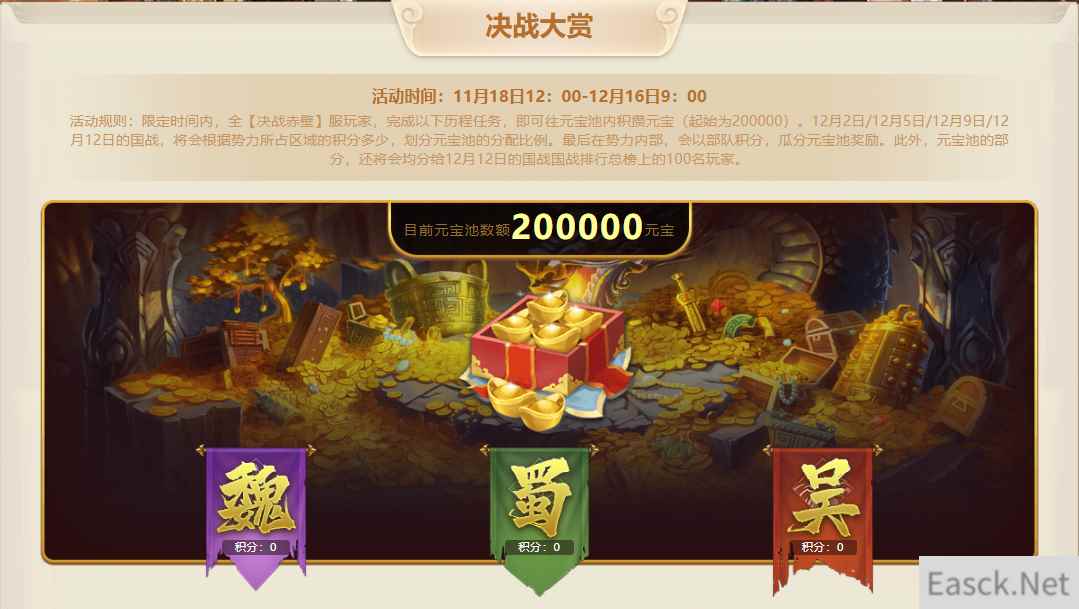 玩家需要参与指定日期的国战,军团占领城池即可获得相应的积分。活动结束后,奖池内的元宝将根据积分状况分送给个势力军团。每人都有机会获得价值千元的超级大奖!