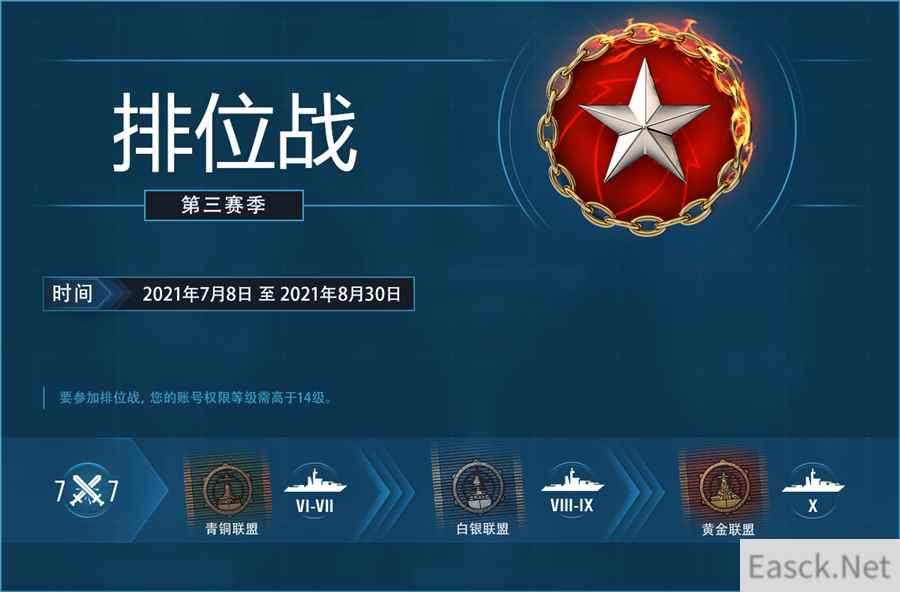 第三赛季规则相较于之前的赛季有轻微调整,首先减少了白银和黄金联盟的星数,使舰长们冲刺排名1和晋级会更加容易;另外调整了可使用的战舰等级,现在6级及以上的战舰均可加入战斗,让更多新兵能驾驶自己心仪的舰船体验排位战的战斗魅力!