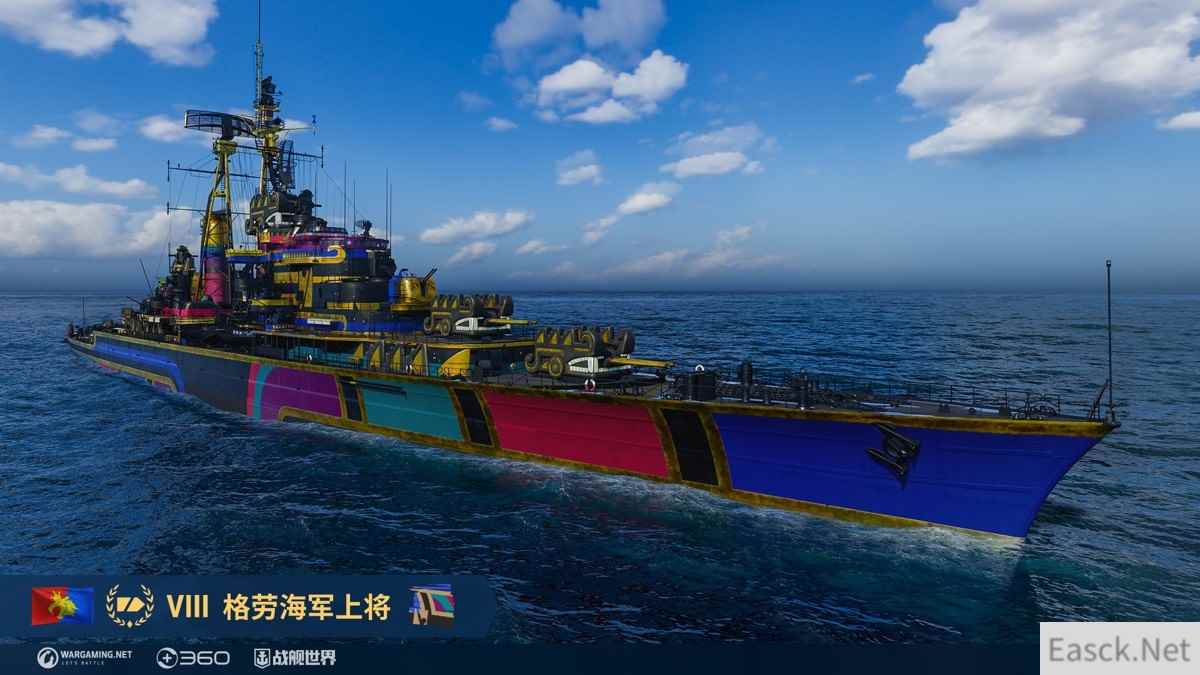 【格劳海军上将】 格劳海军上将是一艘独特的FM巡洋舰,装备了八门152毫米主炮,分置在四座可以360度旋转的炮塔内。FM巡洋舰所特有的“战斗指令”机制,激活后可以显著降低主炮组的装填时间。短时间内倾泻而出的大量输出,在僵持的对局中极有可能打破场面的平衡,帮助团队占据优势。