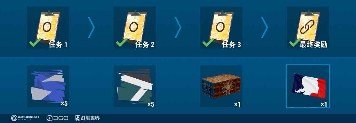 需要注意的是,F系中队高级补给箱还拥有保底机制,在开启24个F系中队高级补给箱后依然没有获得“战舰”物品组中的一个物品,第25个此类型补给箱必定会掉落一艘战舰。这意味着现在获取让·巴尔的途中,还能够通过补给箱获得至少一艘其他战舰。 【连环作战任务】 与F系中队同时到来的,还有一个特别连环作战任务。这一任务可以使用F系V–X级战舰和F系超级战舰完成。完成任务的奖励包括消耗型“里维埃拉”和“革命”涂装、F系中队补给箱、以及最终奖励“玛丽安娜万岁”旗帜。