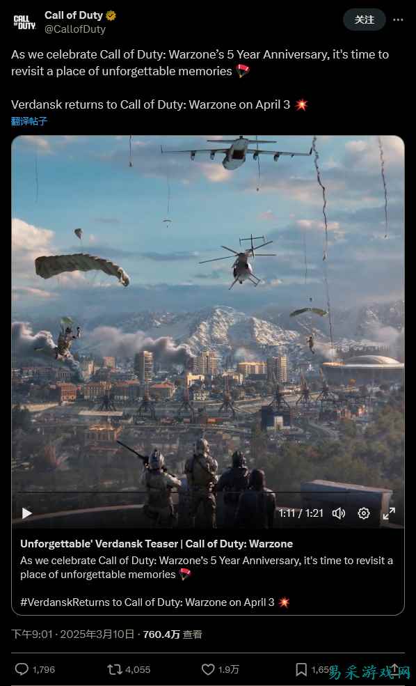 动视日前确认,《使命召唤:战区》原版地图“Verdansk”将作为《使命召唤:黑色行动6》第 3 赛季的一部分回归。 在社交媒体上官方写道:“在我们庆祝《使命召唤:战区》5 周年之际,是时候重温这个令人难忘的地方了。” 《使命召唤:黑色行动6》和《战区》第 3 赛季将于 2025 年 4 月 3 日上线。官方还发布了全新的预告片。 游戏宣传片:游戏第 3 赛季原本计划于 3 月底推出,但进行了推迟,旨在让开发人员“有更多时间为玩家提供出色的体验”。更多游戏第 3 赛季内容将在后续临近发布时揭晓。 |