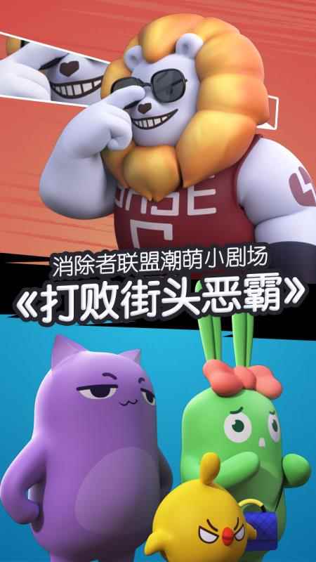 剧场新玩法一:恶斗街头大BOSS 自从消除联萌的四位小伙伴出道以后,首部MV《丹宁执着》引爆喵星,使得四位消除小伙伴人气暴涨,知名度一路飙升。但人红是非多,这段时间消除联萌四小只就被街头的“恶霸”缠上了。在此,团体的成员集体向大家发出求救,希望大家能帮助他们一起制服“街头霸王”。 这位BOSS不仅身宽体胖威猛无比,而且还会向玩家扔出“糖果纸”、“牢笼”等道具不断挑衅玩家、阻碍玩家的消除进程。玩家只有利用6向消除来制造大面积的范围消除、小心翼翼地谋划布局,才能积蓄更多能量攻击街头霸王,将其血量降低为0,完败邪恶BOSS顺利通关。