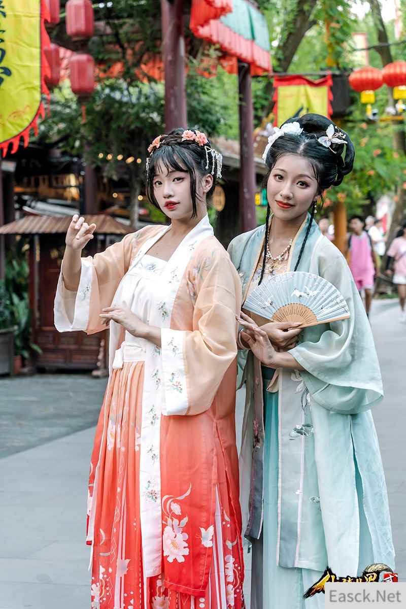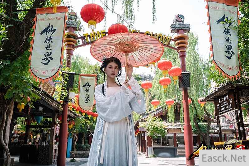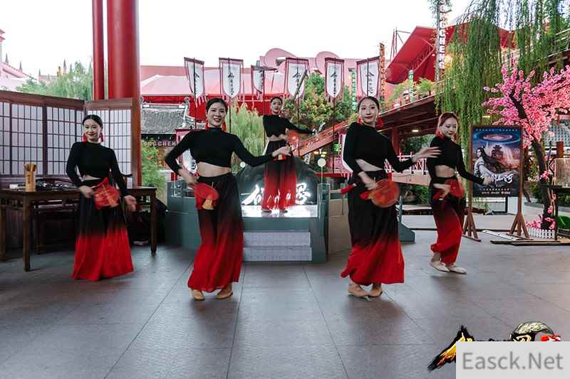 热闹非凡的“凌霄城”街边,身着古风韵味服装的美女们,为人来人往的游客献上优雅的舞蹈。