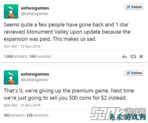 【52pk 11月14日消息】精品解谜冒险手游《纪念碑谷》(Monument Valley)近日发布了全新章节,但因为收费问题而被玩家给了1星差评,开发商十分沮丧。 该游戏原本售价2.49英镑(约合RMB 24元),而最新章节《遗忘海岸》(Forgotten Shores)售价1.49英镑(约合RMB 14元),看起来,价格也合情合理,但不少玩家对此感到非常反感,许多玩家不愿意进行二次消费,并在购买新章节后给游戏给了1星差评,开发商Ustwo Games表示既悲伤又气愤。 游戏的开发商Ustwo Games在其官方Twitter公开表示,“既然不少玩家对我们的更新章节收费不满,那我们下次干脆把游戏免费好了。下次我们游戏不收费,我们卖2美元500游戏币。 |