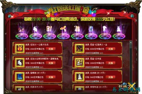 老区活动精彩纷呈 人人都是大赢家! 《征途2X》新区开放时,《征途2》所有老区将同步开启精彩纷呈的利好活动—— ■天降红包雨,每天累积收获红包保底1222元,收获的红包可在红包商店兑换大量超值奖励!更有全新“永久图鉴·红莲奥义·金”、全新“永久配饰·温暖兔兔”、“永久星座图鉴·白羊座”! ■2017年度第一风云会,谁是最强国家、最强家族、最强个人?来赛一赛就知道!专属称号以及拉风坐骑火麒麟、稀有坐骑奖励等你拿! ■全民系列活动开启,完成全民情侣活动、超神活动将获得全新永久时装图鉴“红尘作伴”、专属情侣称号、全新永久头像图鉴、海量经验和强力BUFF加成,最多可增加20万攻防血,让你战力、等级极速狂飙,成为全民超人! ■签署圣诞爱情计划,爽拿坐骑冰晶马、血钻数值、七色花、蓝色妖姬、一生一世特效称号、绝版情侣头像卡等! ■收集玩法送你坐骑、头像、时装、翅膀图鉴等大奖,让你新的一年更帅更美,颜值更上一层楼! ■格斗之王总决战开启,武林高手的巅峰史诗大战, 2017年未最狂热的顶级大赛来袭! 此外,还有《征途2X》在线福袋、家族团圆包、下载手安装手机助手领大奖等多重活动好礼送出。还在犹豫什么,现在就准备拿大礼吧! |